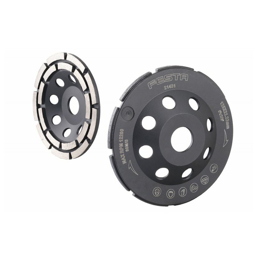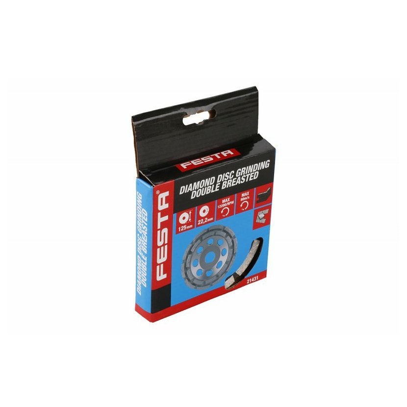 Brusný diamantový kotouč FESTA -dvouřadý, robustní nosný talíř je z pevné slitiny, speciální konstrukce uchycení diamantových segmentů k nosnému disku kotouče, vysoký obsah diamantového prachu v segmentech, použití : pro suché i mokré broušení mramoru, žuly, cihel, zdiva, přírodního i umělého kamene, obkladů, dlažeb, betonu..., tvar a provedení segmentů je vhodné pro hrubé a rchlé obrušování, rozměry : uvedeny v názvu výrobku, balení : papírový box s eurootvorem.