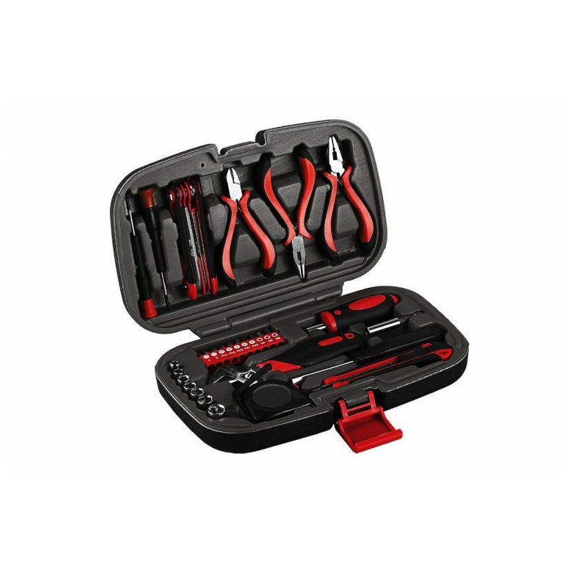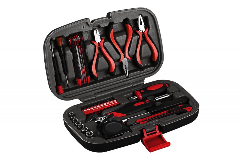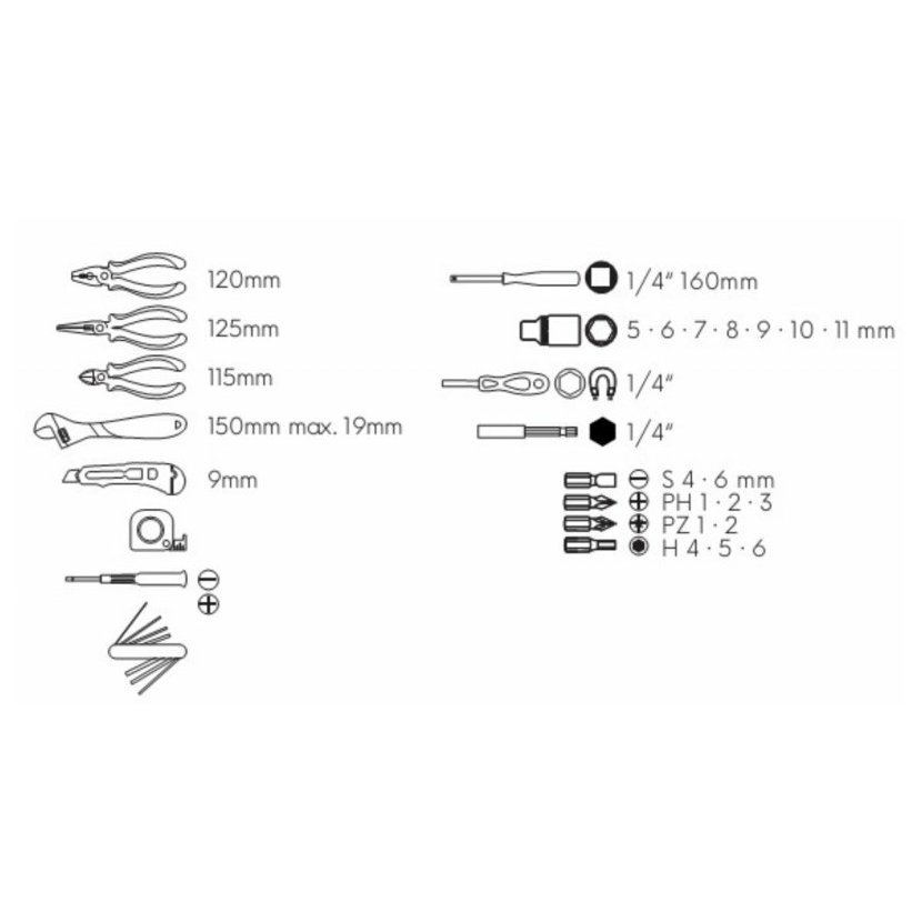 Malá, ale obsahově univerzální sada dílenského nářadí pro domácnosti, do auta, apod. Přehledná organizace, snadná manipulace a prostorově nenáročné uložení v plastovém kufru.