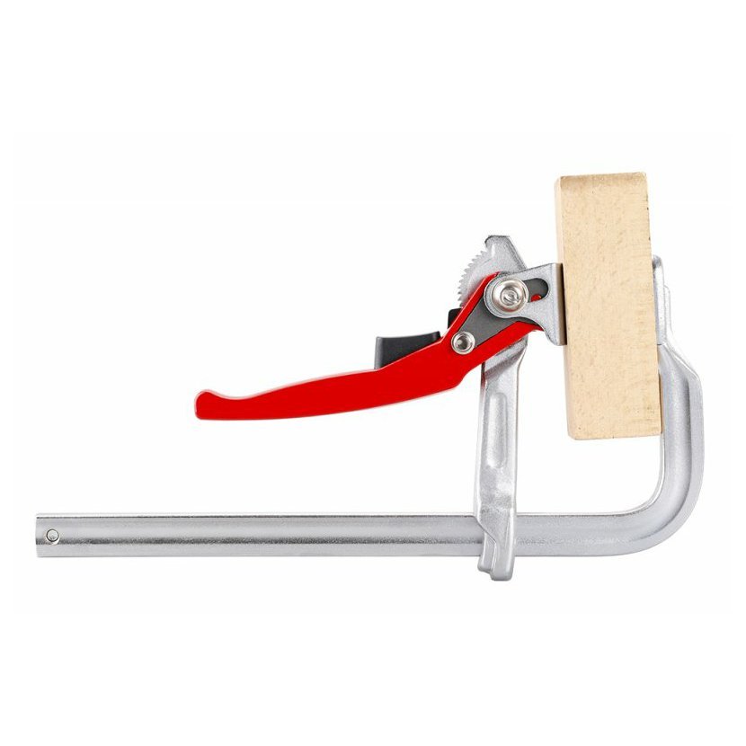Kovaná rychloupínací svěrka. Pákový rychloupínací mechanismus se zubovou pojistkou. Pohyblivá čelist pro přesné přizpůsobení tvaru svíraného materiálu. Pro profesionální stolářské, truhlářské, svářečské práce.
